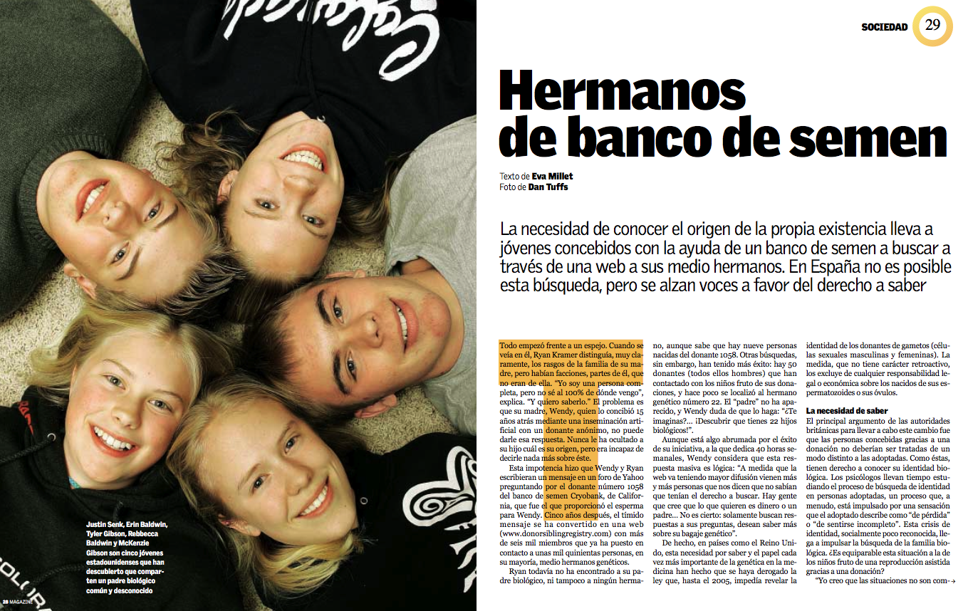 Esta impotencia hizo que Wendy y Ryan escribieran un mensaje en un foro de Yahoo preguntando por el donante número 1058 del banco de semen Cyrobank, de California, que fue quien proveyó el esperma para Wendy. Cinco años después, el tímido mensaje se ha convertido en una web (www.donorsiblingregistry.com) con más de 6.000 miembros que ya ha puesto en contacto a unas 1.500 personas, en su mayoría, medio-hermanos genéticos.