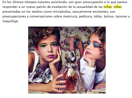 Se ha escrito bastante sobre el asunto, pero destaco esta entrada ‘Hipersexualización de las niñas’ en el estupendo blog Mujeres para la salud. Para la psicóloga Elena Mayorga, es un patrón que responde a necesidades del mercado de consumo: «Hoy en día, los niños y, sobre todo, las niñas, están siendo utilizadas y “sexualizadas” como medio para vendernos a los adultos y a ellas mismas, todo tipo de productos (…) Se está exponiendo a nuestros hijos y sobre todo a nuestras hijas como “mercancía sexual” y eso en un mundo donde los abusos a menores aún es moneda común en muchos lugares, es un hecho extremadamente grave y peligroso». Otra psicóloga, Olga Carmona, denuncia cómo las niñas «van asumiendo con naturalidad perversa su condición de objetos sexuales. Así, se desarrollan mujeres frágiles, extremadamente vulnerables, inmersas en una batalla constante consigo mismas, de la cual es imposible que salgan victoriosas».