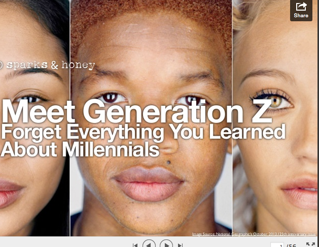 1. Hola Rodrigo, gracias por contactar el blog. Como ya comento en la entrada, este reportaje surge de un estudio hecho por diversas agencias de publicidad estadounidenses. Publiqué el post hace dos años y, curiosamente, mientras que de los millenials se habla todavía un montón, los Z están un poco en la trastienda. En este link http://www.slideshare.net/sparksandhoney/generation-z-final-june-17 (que ya doy en el blog) está el estudio. Hay varios comentarios interesantes, también. Espero que te sirva. Saludos. Eva