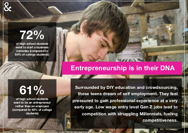 Por lo que respecta al trabajo, son conscientes de que van a tener que buscarse la vida en el ámbito laboral. Debido a que los empleos tradicionales cada vez son más escasos, tienen muy claro que les va a tocar emprender un negocio y no tienen miedo de ello. Otra cosa interesante que revela el estudio  (hecho entre 11.000 chicos y chicas), es que el 69% prefiere ser más inteligente que más guapo que el resto. El artículo también deja caer que los Z «beben menos y fuman menos porros que la generación previa», que «se meten en menos peleas en la escuela y tienen menos encuentros sexuales».