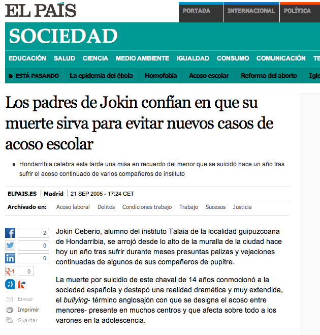 Hasta hace poco en España el bullying era un tema que no se tocaba o se despachaba con un «son chiquilladas». De hecho, si la víctima tenía el valor de denunciarlo, se le tildaba de chivato y punto. Tuvo que ocurrir una tragedia para que, en 2004, este término anglosajón entrara en las páginas de los diarios y la sociedad empezara a percibir que el abuso escolar no estaba nada, pero que nada, bien. Releer el caso de Jokin Ceberio, el adolescente vasco que se suicidó a causa del bullying, pone los pelos de punta. Desesperado ante del maltrato continuado y la pasividad de los responsables de su escuela, Jokin se tiró por la muralla de Fuenterrabía cuatro días antes de cumplir los 14 años. Un año después, sus desolados padres declararon a El País que confiaban que su muerte sirviera para evitar nuevos casos de acoso escolar.