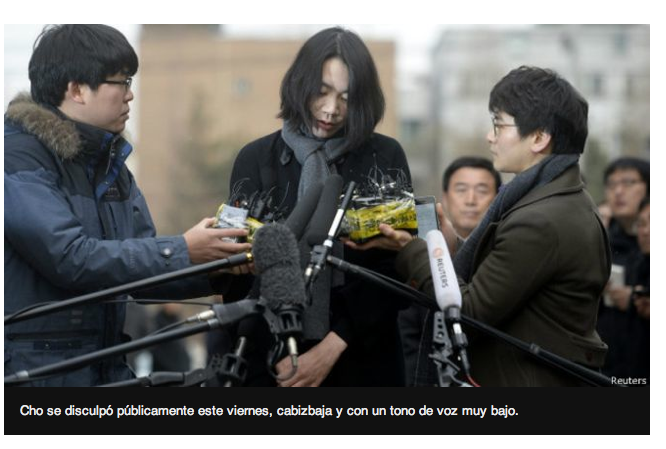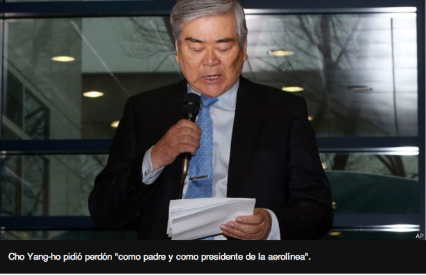 Coreana mimada 1«Me disculpo sinceramente», dijo la ya exejecutiva de Korean Air ante la prensa, visiblemente abatida. Sin embargo, fue su padre quien realizó la declaración más contundente. Como explica la BBC: «Cho Yang-ho, pidió perdón en nombre de su hija y en el suyo, ‘como padre y como el presidente de la aerolínea’».