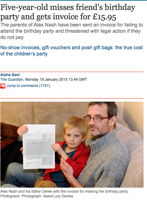 Dos días después, leo en la web de The Guardian esta noticia: Un niño de 5 años no va a una fiesta y recibe una factura de 15.95libras. Al parecer, al niño (inglés) lo invitaron a una fiesta en una pista de esquí artificial, en Plymouth. Los padres confirmaron pero, en el último momento, se dieron cuenta de que el pequeño estaba «double booked» (es decir, tenía dos compromisos; la fiesta y una visita a los abuelos). Ante la disyuntiva, tiró más la familia y el niño no fue a la fiesta. La madre no avisó a la otra madre y la cosa hubiera quedado así, como una muestra de descortesía más bien poco británica, cuando recibió la factura.