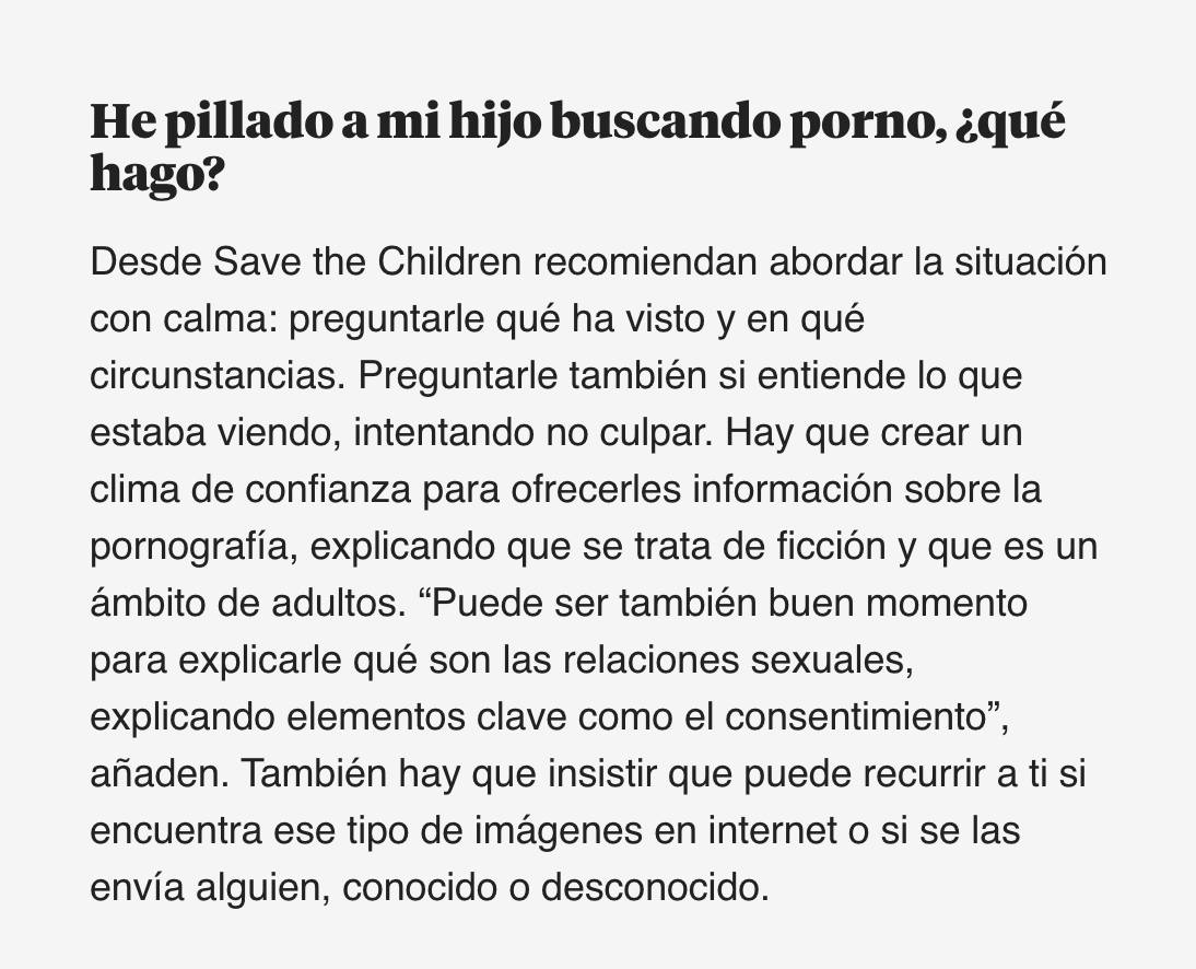 La educación, de nuevo, es clave. Porque, como insisten desde Save the Children: “Los controles parentales pueden evitar el problema temporalmente, pero en ningún caso sustituyen a una educación sexual integral que enseñará a desarrollar una actitud crítica, que les acompañe toda su vida”.//
