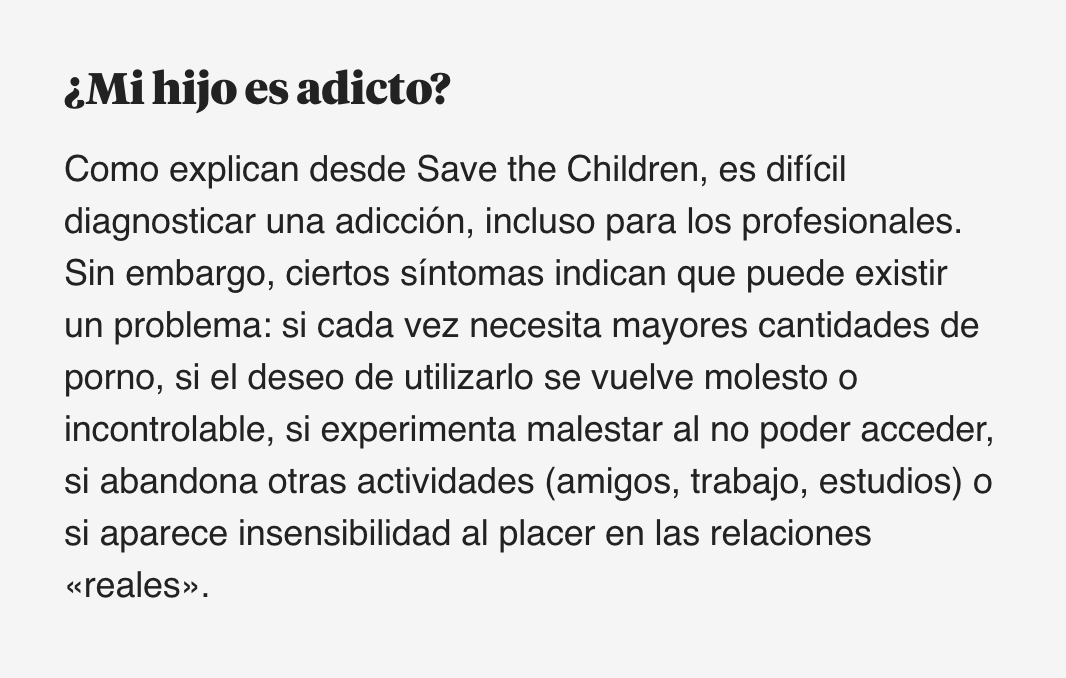 Por ello, como cuenta la psicóloga infantil Núria Casanovas, a menudo se descubre cuando los menores van a consulta por otros problemas: “Aunque la adicción al porno es un problema recurrente, cuando los niños o adolescentes vienen a consulta no es debido a ello. Esta dependencia se detecta porque algunos son mucho más vulnerables al acoso sexual en las redes, han publicado fotos que no eran adecuadas o alguien los ha manipulado”, explica esta experta, presidenta del Consell social del Col•legi Oficial de Psicologia de Catalunya.