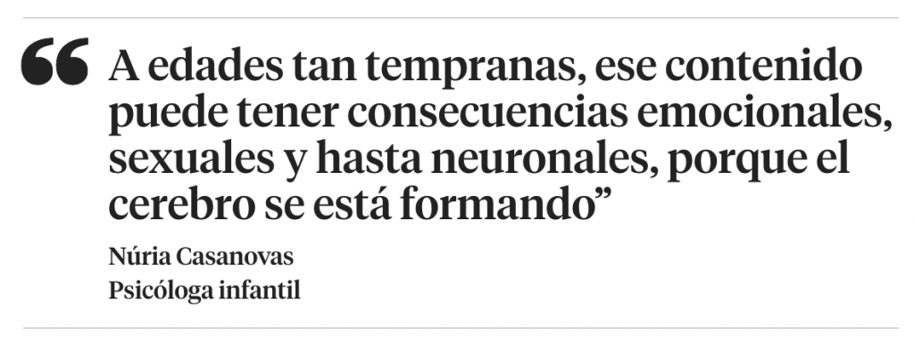 Que el consumo de porno en la edad adulta sea o no recomendable sería otro tema, pero lo que está clarísimo es que, a edades tan tempranas, esta exposición es nociva. Los contenidos pornográficos, como corrobora la psicóloga Núria Casanovas, afectan a los menores: “Pueden comportar consecuencias emocionales, sexuales e, incluso, neuronales, porque el cerebro se está formando y puede haber un daño neuronal”. Las imágenes, a menudo perturbadores, violentas y difíciles de asumir serían como un golpe en la psique infantil. ¿Dejan una marca, entonces?: “Sí, es como un traumatismo”, asegura.