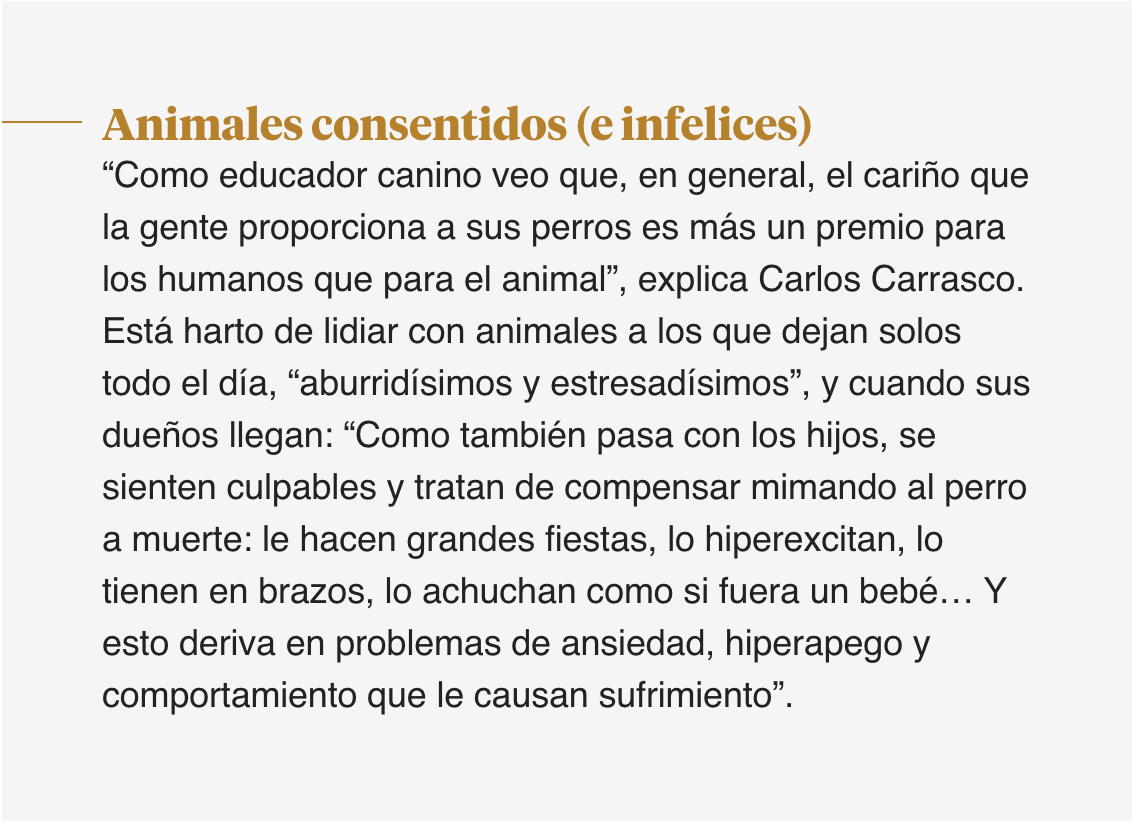 Carrasco tiene muy claro que al tratar a un perro como a un niño “no lo estoy respetando, porque le pones una responsabilidad que no le corresponde”. Sin embargo, es cierto que en algunas cosas, las mascotas -en especial los perros- son como criaturas: “Necesitan límites y normas, necesitan ejercicio físico y mental”, enumera. Un equilibrio que no se da achuchándolos constantemente ni vistiéndoles con accesorios de marca ni gastando una fortuna en productos de belleza. “Si pensáramos en el bienestar del perro, quizás lo que tendríamos que hacer es, en lugar de mimarlo gratuitamente, dedicarle tiempo para hacer suficiente ejercicio físico, ponerle límites y normas y comunicarnos de una manera adecuada con él”.