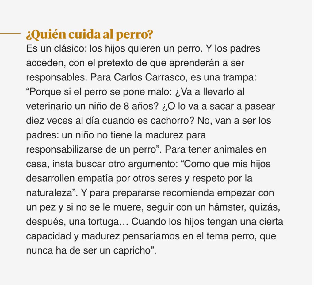 ¿Un perro no puede ser un hijo, entonces? “No”, responde Carrasco, sin dudar. “A ver, podemos quererlo mucho y es evidente que es un integrante de la familia, y por eso lo trataré bien, cuidaré de su bienestar, de alimentarlo lo mejor posible, de cuidar su salud, de proporcionarle el ejercicio físico y mental y la estimulación que necesita para estar sano y equilibrado…. Pero son animales. Son perros. O gatos. No son mis bebés ni mis hijos. Eso no lo pierdo de vista”.