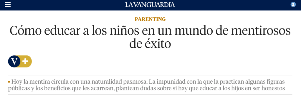 La mentira circula con una naturalidad pasmosa en la sociedad actual. La impunidad con la que la practican algunas figuras públicas y los beneficios que les acarrean, plantean dudas sobre si hay que educar a los hijos en ser honestos. De esto va mi publicación en la sección de Parenting del Magazine de La Vanguardia. Os comparto el link y el texto, a continuación: