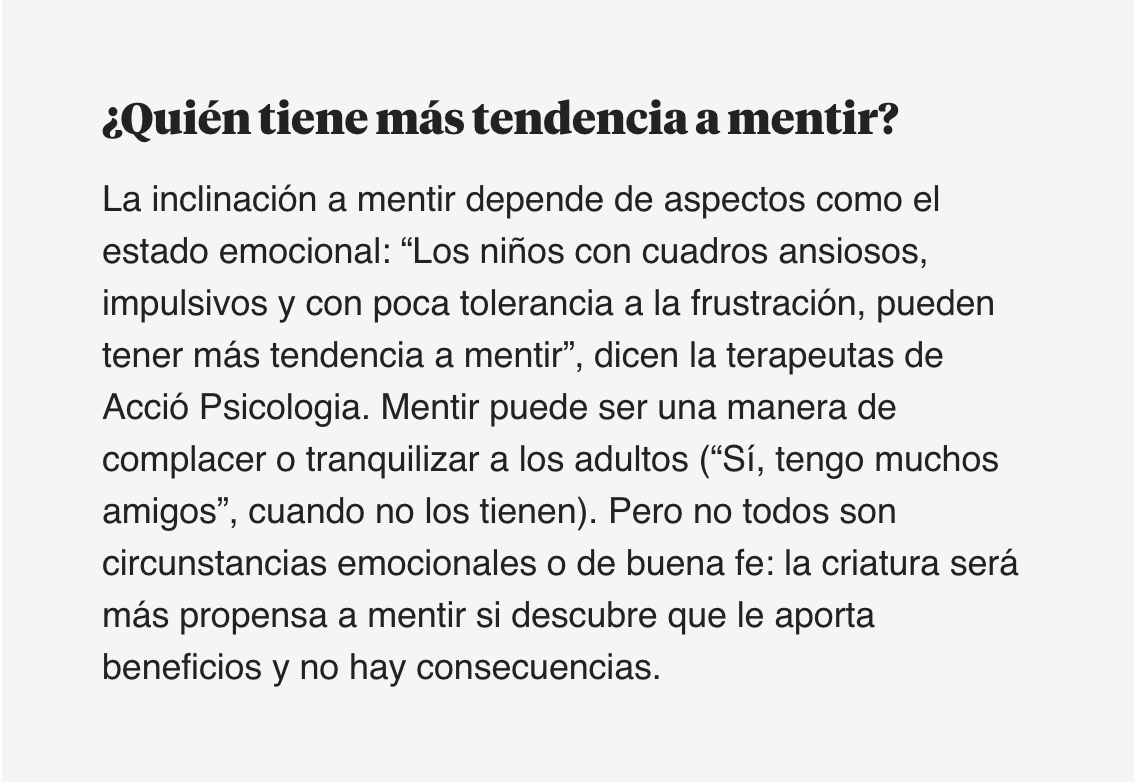 En cierto modo, la mentira a edades tempranas sería normal, porque “puede ser un regulador de conducta y un recurso para relacionarse”, aseguran desde Acció Psicologia. Pero, si no se corrige, mentir puede convertirse en un problema. ¿Cuáles serían las líneas rojas? “Cuando el niño la utiliza como única manera de obtener algo que desea, cuando confunde realidad y fantasía en edades que no corresponden y cuando la tolerancia a la frustración es baja y no soporta que le corrijan o, a pesar de que se le corrige, continúa utilizándola”, enumeran.