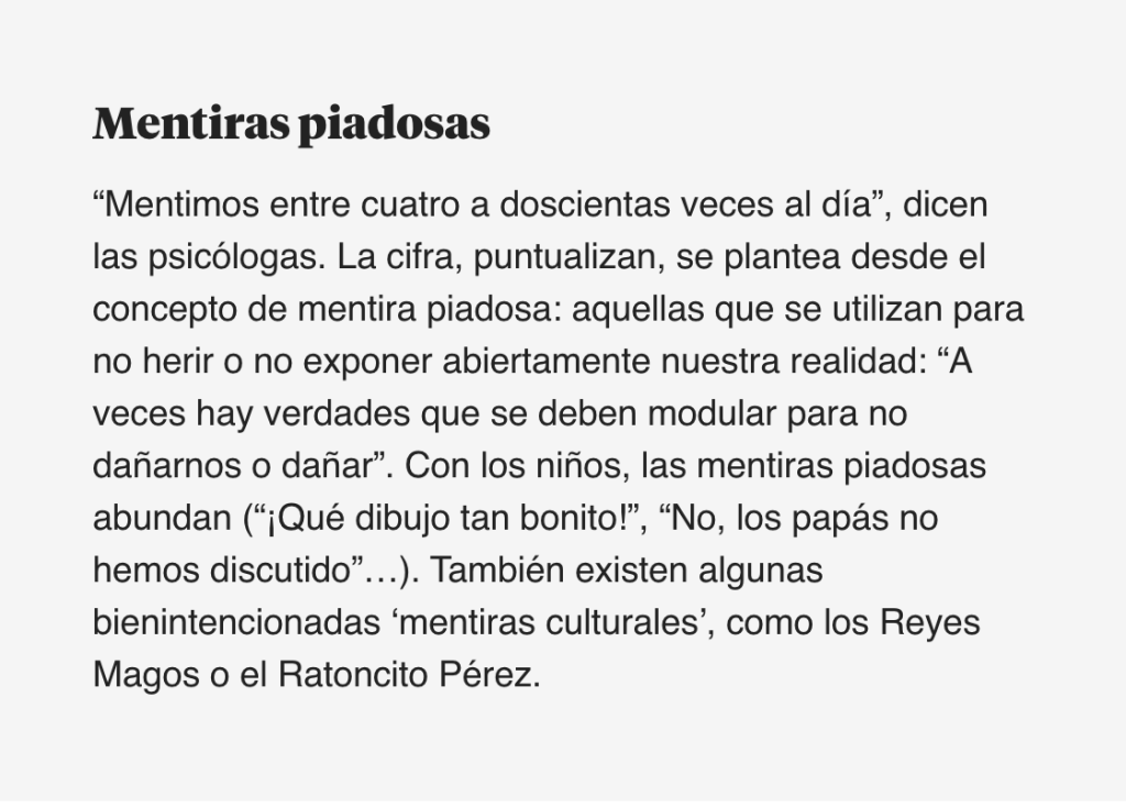 Los valores de una sociedad, añaden las psicólogas, también influyen a la hora de mentir: “Y hoy estamos estimulados socialmente a mentir —sobre quién somos, qué pensamos realmente, sobre nuestro físico…— Las redes sociales son un ejemplo perfecto”. Sin olvidar, por supuesto, que “a menudo vemos situaciones de personas públicas que han mentido, sin tener consecuencias”.