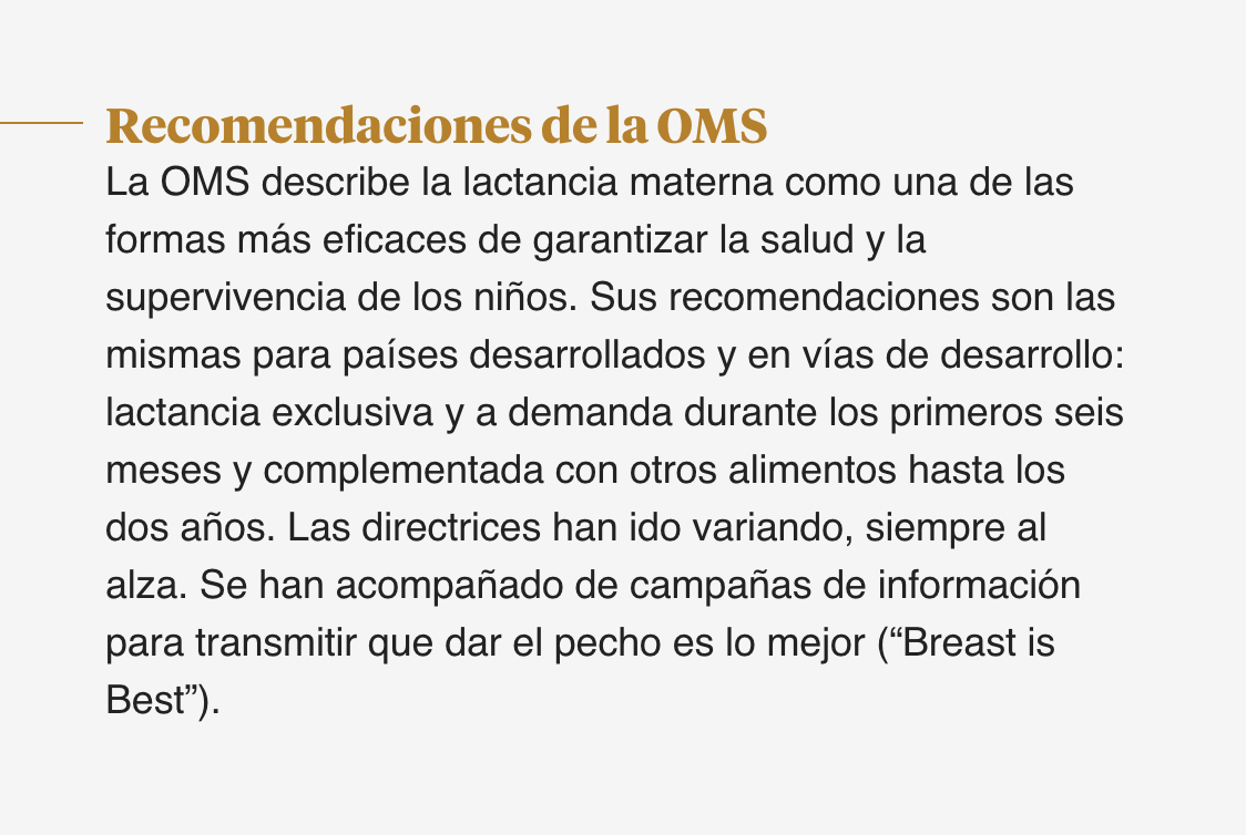 En sintonía con los tiempos, la forma de divulgar los beneficios de la lactancia ha cambiado: se informa de un modo contundente, comparando niños alimentados con leche materna y niños no alimentados así. Este es el enfoque de la Asociación Española de Pediatría que en sus Recomendaciones sobre la lactancia materna señala: “El mayor riesgo de numerosos problemas de salud” en los niños alimentados con leches artificiales.
