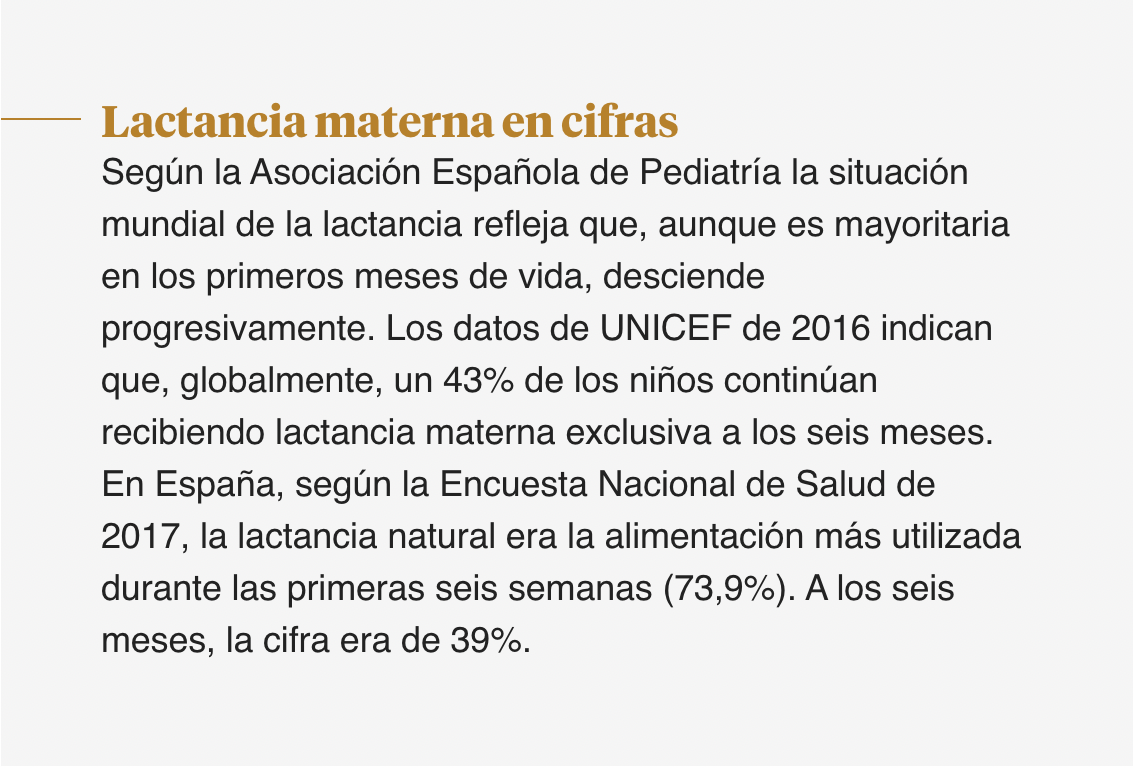 Dados estos datos, formulo a la Asociación Española de Pediatría una pregunta que hoy ya parece urgente: ¿Se puede criar un hijo sano y feliz sin que haya sido amamantado? La respuesta es… sí: “Un niño puede criarse sano y feliz con la administración de las fórmulas adaptadas”, responde Rosaura Leis Trabazo, coordinadora del Comité de Nutrición y Lactancia Materna de la AEP. Sin embargo, esta doctora matiza: “Varios estudios ponen en evidencia diferencias entre los niños alimentados al pecho o con fórmulas en el riesgo de determinadas patologías, tanto en la edad infantil como en la adulta, así como en la composición del microbiota intestinal, que se asocia a múltiples enfermedades. Por estos motivos, siempre que sea posible, debemos promocionar la alimentación del lactante con leche de mujer”.
