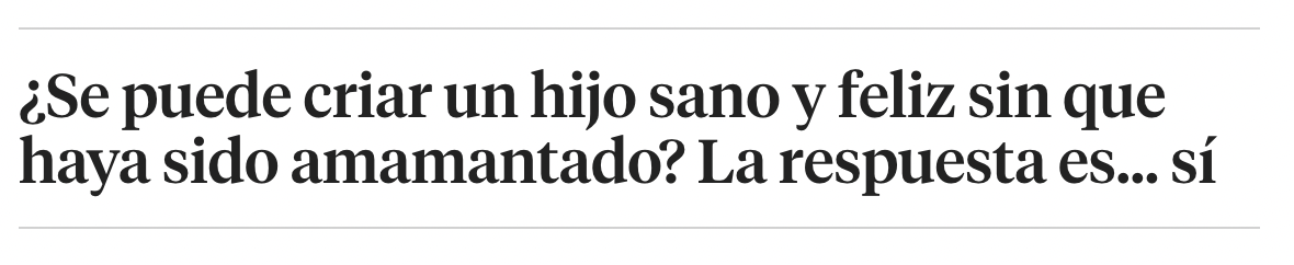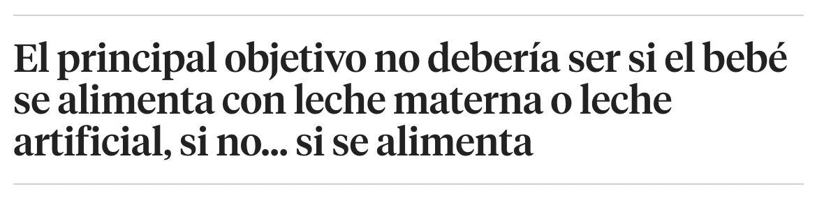 En su veredicto, Oster escribe que la lactancia temprana “brinda algunos beneficios para la salud” (menos infecciones gastrointestinales y menos eccemas), “aunque la evidencia que los respalda es más limitada de lo que se puede afirmar”. Observa que la relación entre la lactancia y la muerte súbita del bebé es “difícil de probar” y desvincula su relación con la obesidad y una mayor inteligencia. “Los datos sobre la lactancia”, añade, “no proporcionan evidencia sólida sobre los beneficios para la salud o cognitivos a largo plazo para tu hijo”. En cambio: “Posiblemente existan algunos beneficios para la salud de la madre, relacionados con el cáncer de mama”. Si una madre decide dar el pecho: “Maravilloso”, dice Oster. Pero lo contrario no es una tragedia: “Puede que sea más trágico que pases un año sintiéndote mal por no darlo”.//EVA MILLET