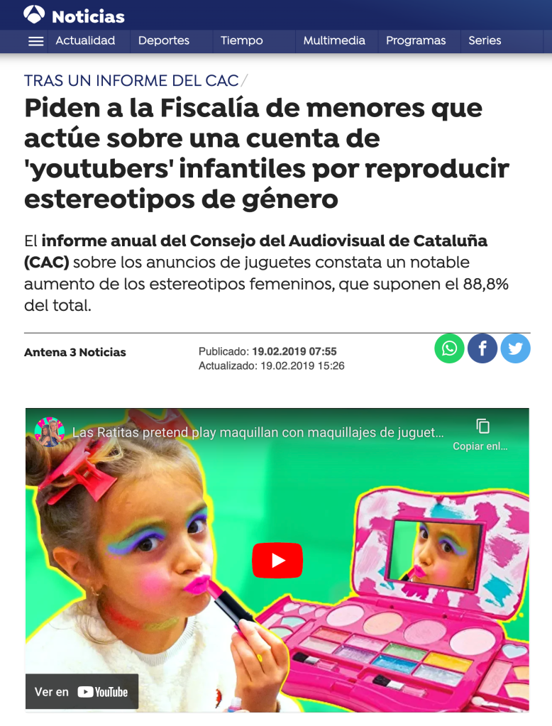 El video tiene 140 millones de visualizaciones, pero no ostenta el récord de visitas de Las Ratitas. Sin embargo, fue el que provocó que, por primera vez en España, alguien cuestionara este tipo de contenidos. Ocurrió en 2019, cuando la organización Save the Children y el psicólogo Javier Urra —ex defensor del Menor de la Comunidad de Madrid—, solicitaron a la Fiscalía de Menores de Barcelona iniciar una investigación sobre el canal. La petición surgió a raíz de un informe del Consell de l’Audiovisual de Catalunya sobre la publicidad de juguetes, en el que se incluyó a los youtubers infantiles. Este organismo veía “con inquietud” la aparición de canales promocionales: “Que tienen audiencias masivas y que reproducen sin rodeos todo tipo de estereotipos”.