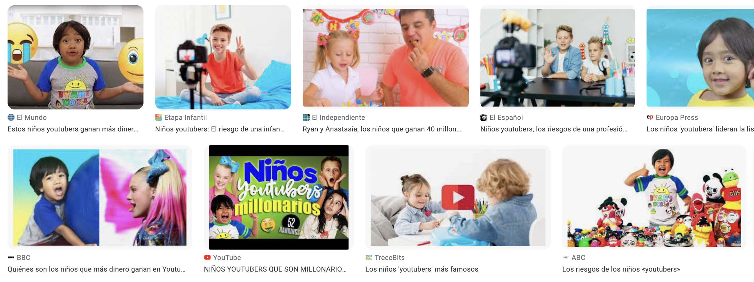 En España también tenemos nuestra representación de youtubers (o influencers) infantiles, dirigidos por sus progenitores. La pionera fue Martina d’Antiochia, que a los diez años abrió un canal, La diversión de Martina, donde contaba su vida. Martina se convirtió en todo un fenómeno, con millones de seguidores que la han visto, literalmente, crecer. En la senda de Martina aparecieron MikelTube (8,4 millones de suscriptores), su hermano, LeoTube (3,26 millones), Arantxa Parreño (3,95 millones), El Mundo de Clodett (2,79 millones) y, por supuesto, Las Ratitas: el canal de las hermanas Gisele y Claudia Itarte, que acumulan un patrimonio en YouTube que roza los 25 millones de suscriptores.