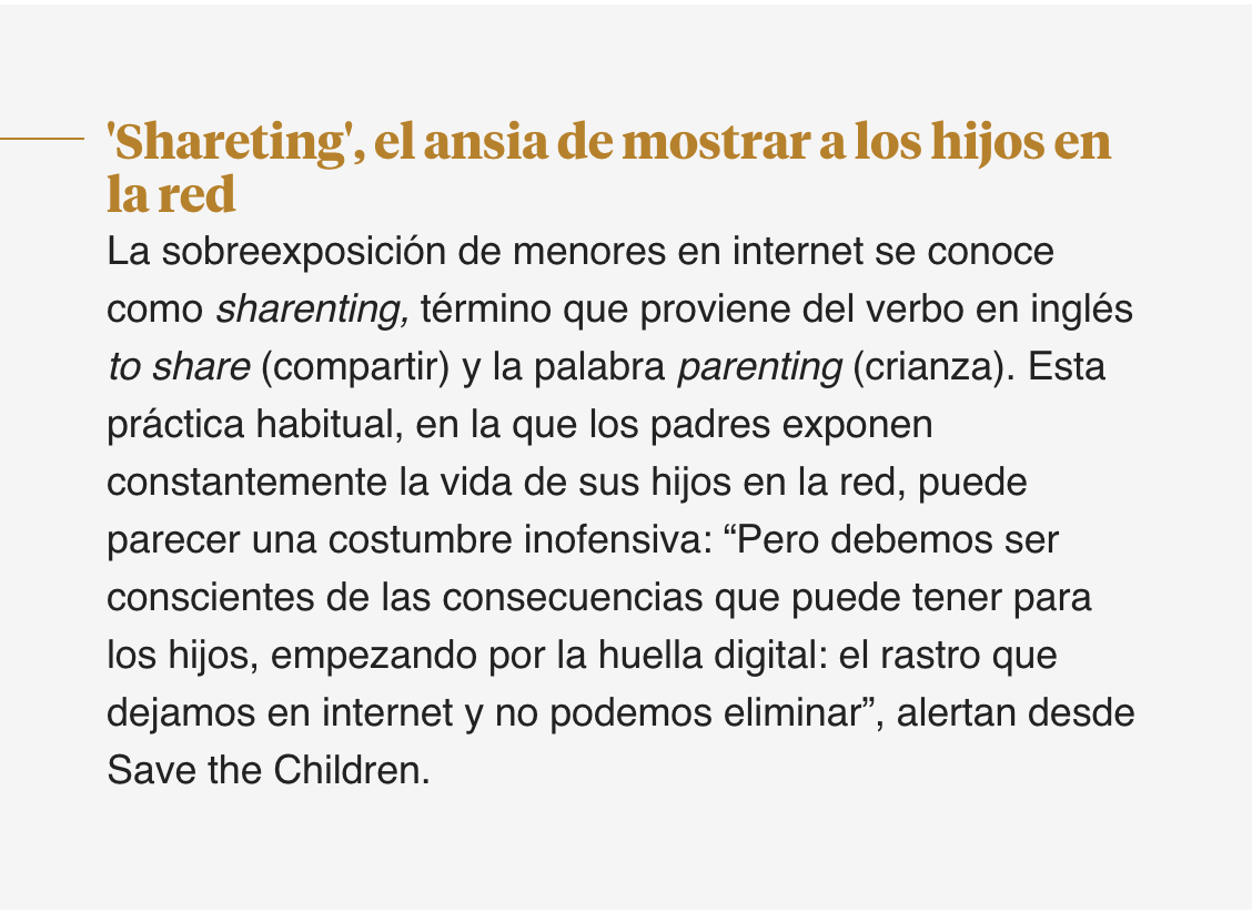 Ese mismo año Save the Children publicó un informe titulado Violencia Viral, donde se analizaba la violencia contra la infancia y la adolescencia en el entorno digital. Para esta oenegé, el sharenting es una práctica de alto riesgo, ya que representa una sobreexposición en la red, que puede vulnerar los derechos de los menores.
