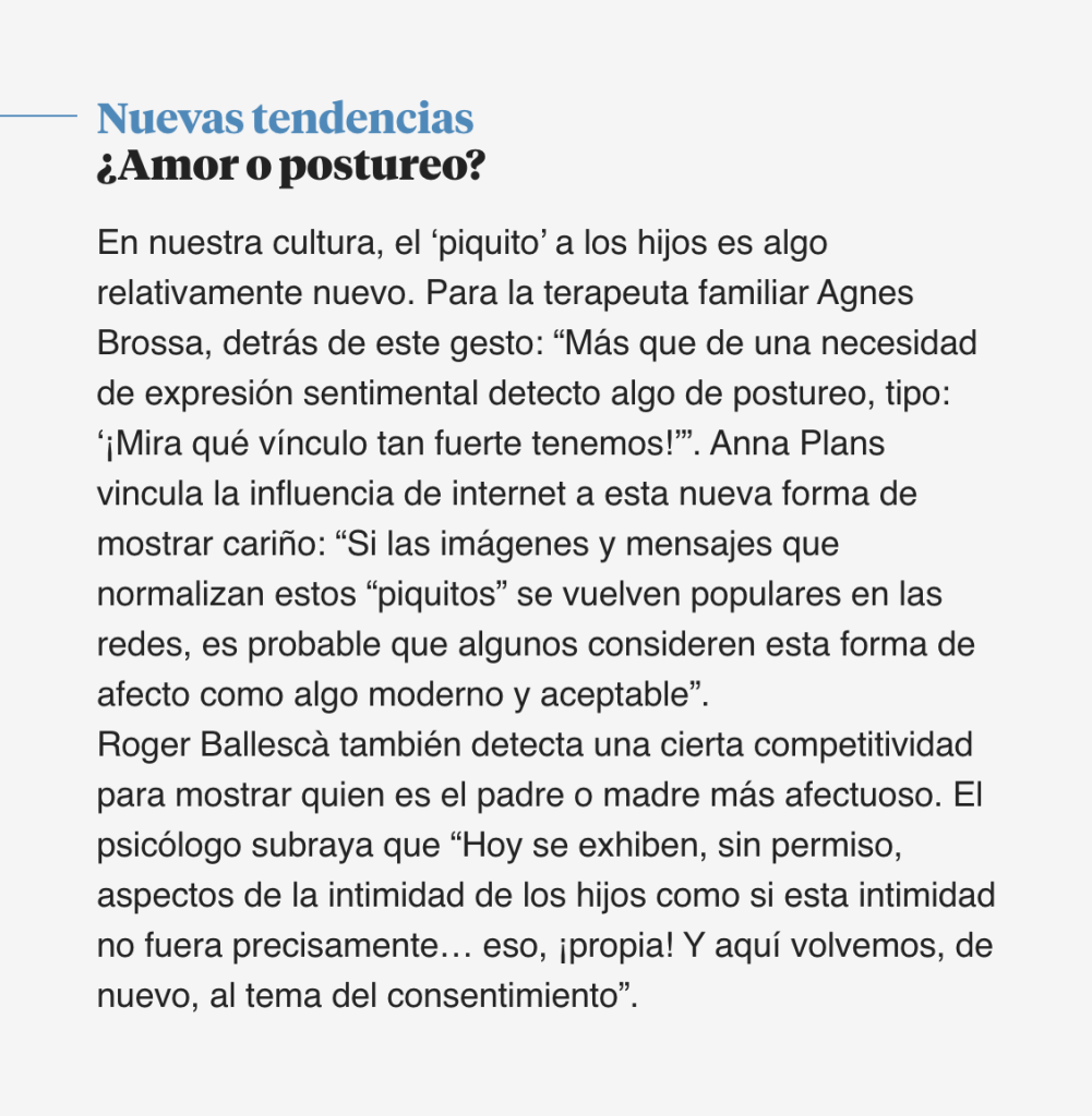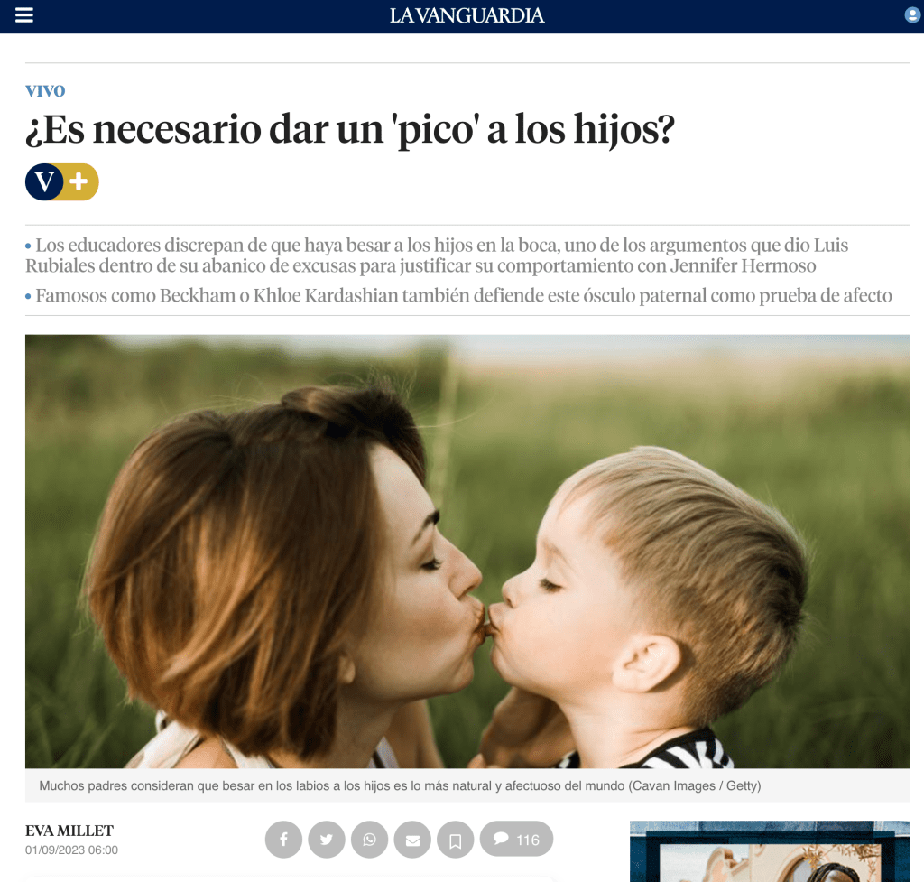 Entre las expresiones de afecto que se dan en las crianzas actuales destaca una novedad: los ‘piquitos’ a los hijos. Besos fugaces en los labios, que muchos padres y madres exhiben en redes sociales como prueba del intenso vínculo con su prole. Con el ‘piquito’ de máxima actualidad, después del escándalo en torno al beso no consentido de Luis Rubiales a una jugadora, la pregunta es si esta práctica es adecuada o desaconsejable. El artículo original lo publiqué en La Vanguardia.