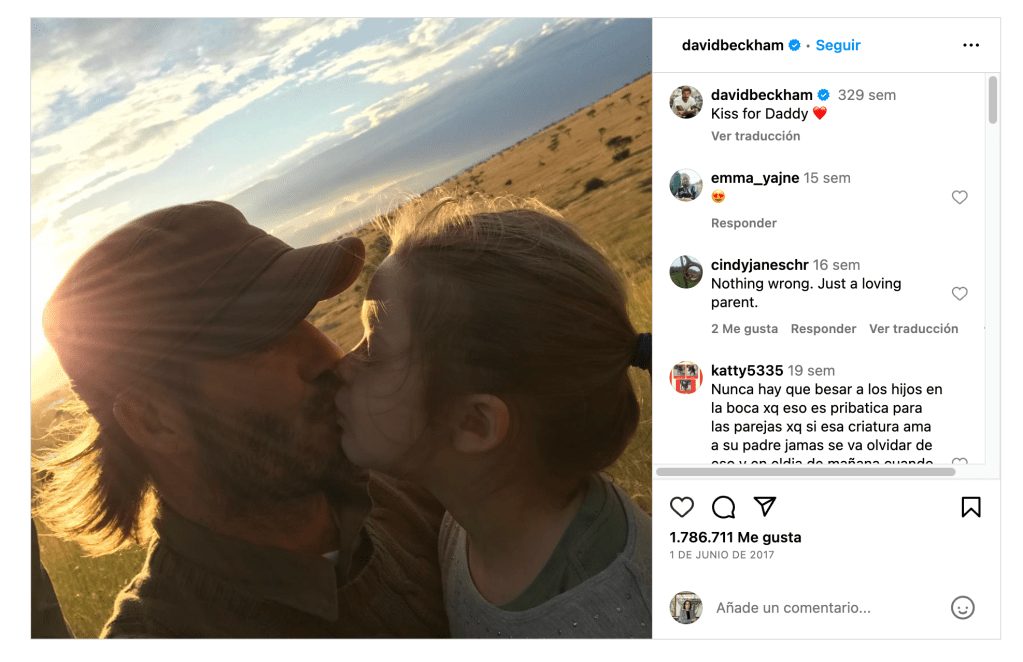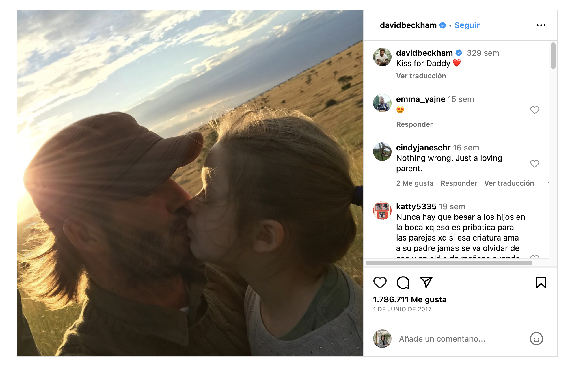 Cuando los Beckham hacen algo, la repercusión en redes es enorme: por ello, los piquitos a Harper se saldan con cientos de miles de “Me gusta” y muchos comentarios elogiosos (“Puro amor”, “Nunca dejes de besar a esa florecilla”, “Precioso”, “David obviamente adora a su hija; ¡que padre tan fabuloso!”). Pero, también, comentarios críticos, que van del “repugnante” y “pervertido” al “que le quiten la custodia”. Destacan algunas observaciones más elaboradas, como la que una seguidora que, en español, escribe: “Si esa criatura ama a su padre jamás se va olvidar de eso y cuando tenga pareja, va a pensar que besa a su padre, y ahí no va haber emoción ni pasión de pareja, sino solo emoción de padre”. Otra seguidora se preguntaba si Beckham también besaba a sus hijos varones.