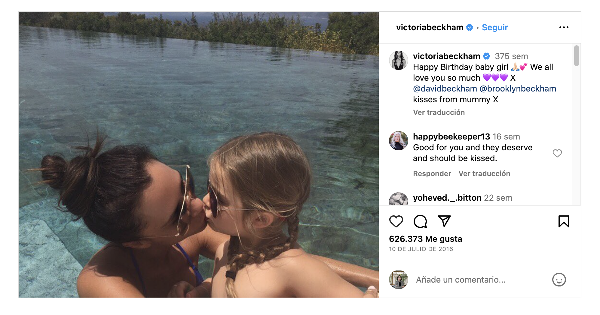 En una línea similar está David Beckham, quien más de una vez ha mostrado en sus redes sociales imágenes suyas dándole un “pico” (pecking en inglés) a su hija pequeña, Harper. El fondo varía (puede ser una piscina infinita o la sabana africana), pero la forma es siempre la misma: el padre besando en los labios a la niña y felicitándole, emocionado, el cumpleaños o lo que toque ese día en Instagram. No faltan los emoticonos de corazones y frases como “Kiss for Daddy”.