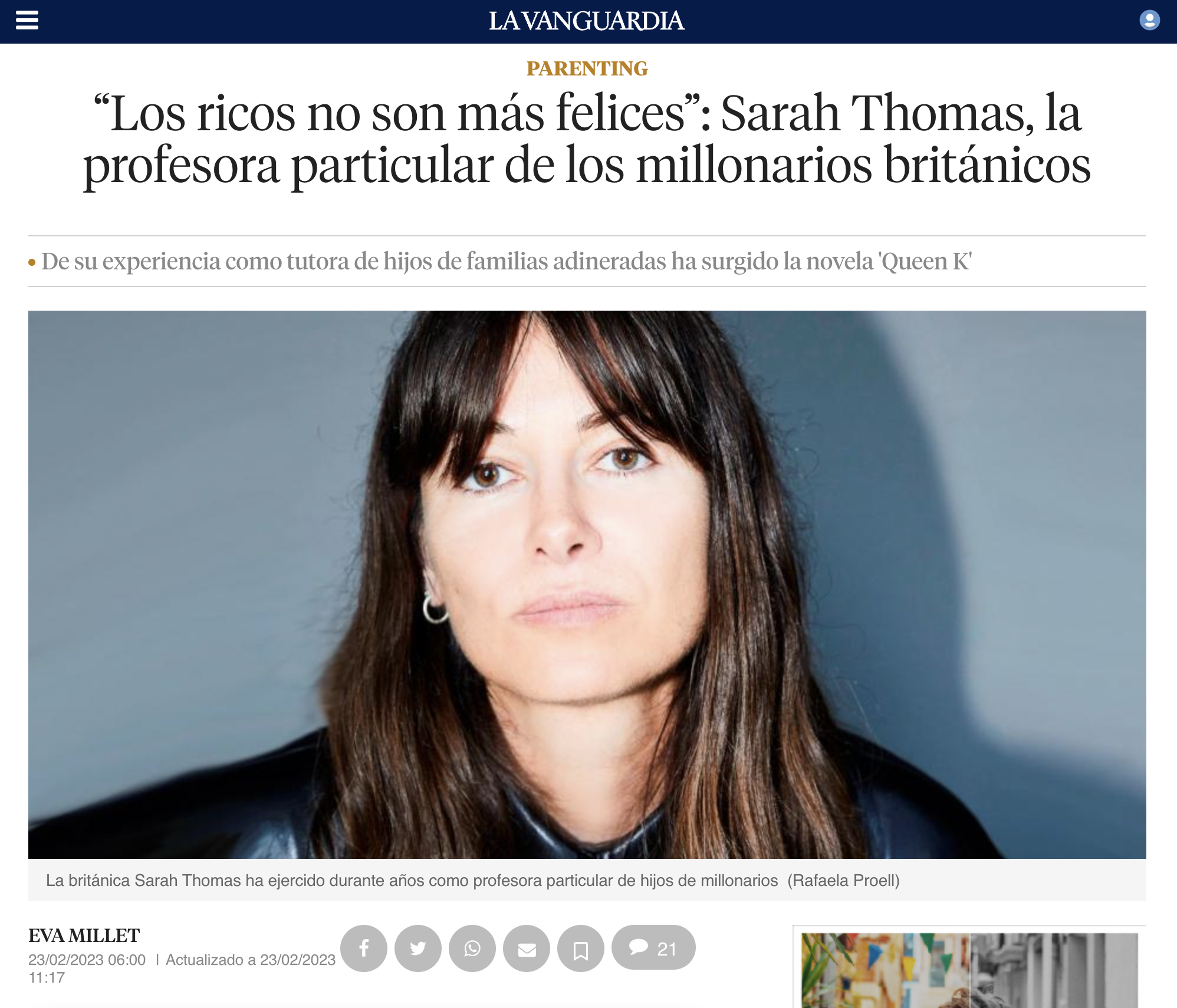 Este ha sido el trabajo de Sarah Thomas, que nació en Escocia, creció en Kenia y estudió en un internado privado en Inglaterra. Después se licenció en Historia en Londres, la ciudad donde vive. Su perfil es perfecto para una tarea que puede ser remunerada con unos 900 euros por semana, si se convive con la familia. Queen K es la primera novela de Thomas, a quien entrevistamos vía Zoom.
