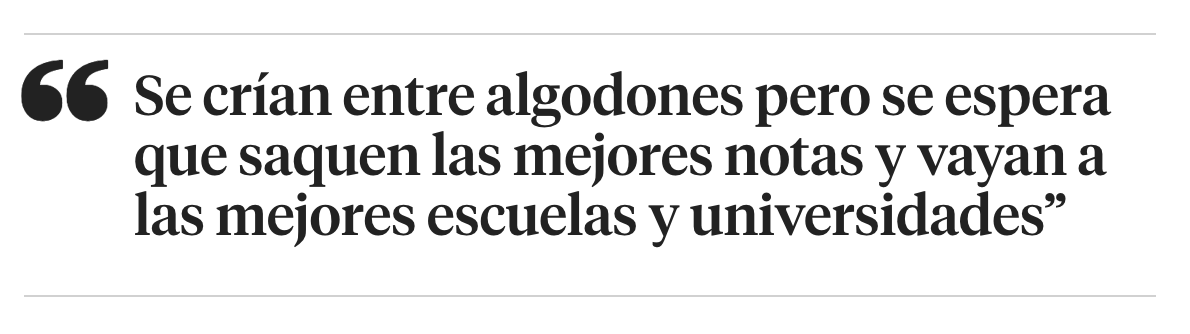 Se crían entre algodones pero se espera que saquen las mejores notas posibles y vayan a las mejores escuelas y universidades. Los padres quieren decir a sus conocidos que sus hijos han sido admitidos en esta escuela o en esta universidad de élite. Hoy esto es algo realmente muy competitivo, ¡incluso en las escuelas de primaria!