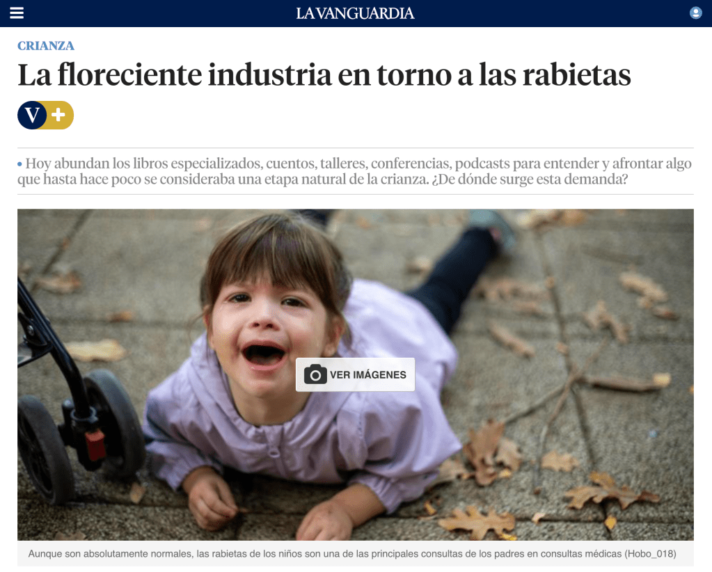 Las rabietas también se están patologizando. Me comentan profesionales de la psicología y maestras que hay padres quienes, en vez de limitarlas o sobrellevaras, lo que quieren es un diagnóstico. En consecuencia, lo que hasta ahora era un proceso (muy pesado, pero bastante normal) del desarrollo, se ha convertido prácticamente en un producto, alrededor del cual se está desarrollando una floreciente industria de libros, coaches, etc. De todo ello hablé en este artículo de La Vanguardia, que también os comparto a continuación: