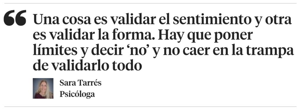 Al validar las emociones, ¿se corre el riesgo de validar también el comportamiento? “Una cosa es validar el sentimiento, pero otra cosa es validar la forma. Yo puedo aceptar que estés enfadado, pero no cómo me lo has demostrado. Está claro que hemos de poner límites y decir ‘no’ y no caer en la trampa de validarlo todo”, responde Tarrés. En este matiz estaría la clave: “Este es el gran engaño a veces de estas corrientes de crianza y de maternidad, que utilizan unas palabras muy efectivas (‘respetuosa’, ‘consciente’…), de forma recurrente, pero son tendencias que, si se llevan al extremo, pueden afectar la salud mental y emocional de la familia”.