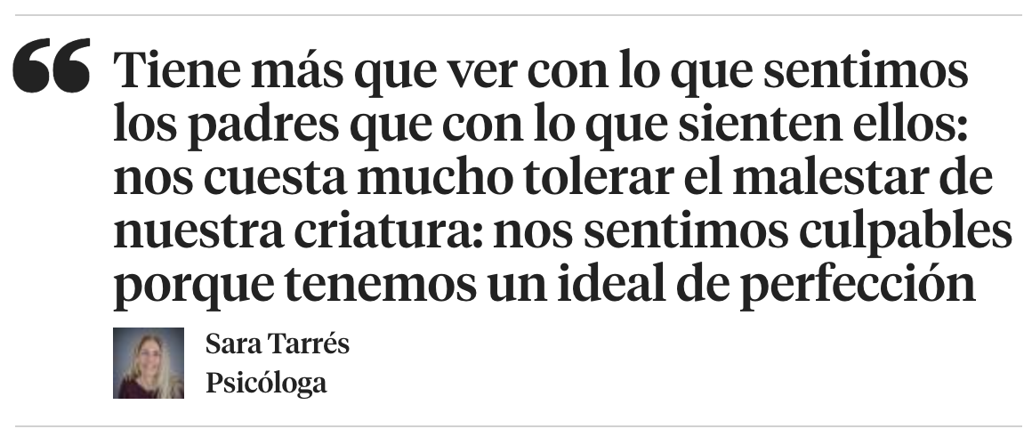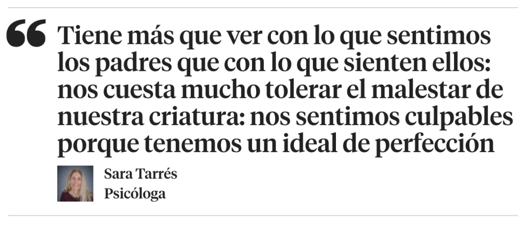 ¿De donde surge esta urgencia por gestionar las rabietas? ¿Son hoy peores? ¿Más frecuentes?¿O es normal preocuparse por unos episodios que, en efecto, pueden ser muy desagradables? Sara Tarrés es también madre y sabe de rabietas. Sin embargo, considera que esta demanda por gestionarlas tiene otros motivos: “Para mí, tiene más que ver con lo que sentimos nosotros, los padres, que con lo que sienten ellos. Creo que nos cuesta mucho ver y tolerar el malestar de nuestra criatura: nos sentimos culpables, malos padres y educadores, porque tenemos un ideal de perfección, de cómo queremos ser y de los hijos que tendremos, y la realidad es otra cosa… ¡Los hijos tienen rabietas!”. Rabietas, añade: “Que muchas veces no tienen nada que ver con el tipo de madre o padre que somos, sino que forman parte de su evolución”.