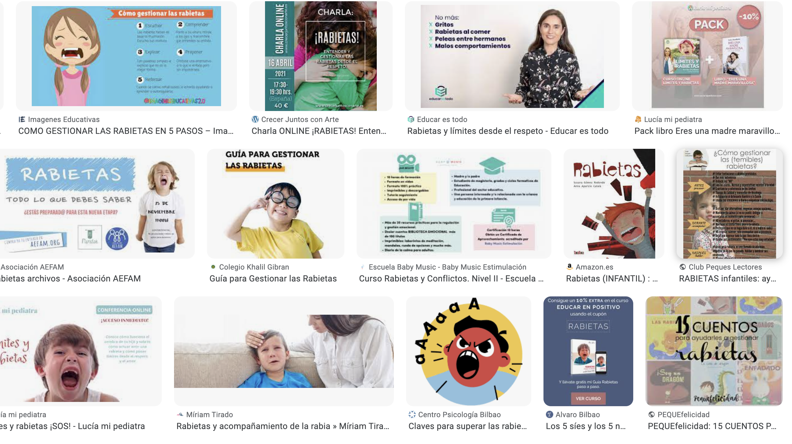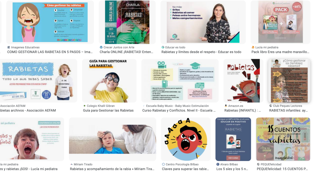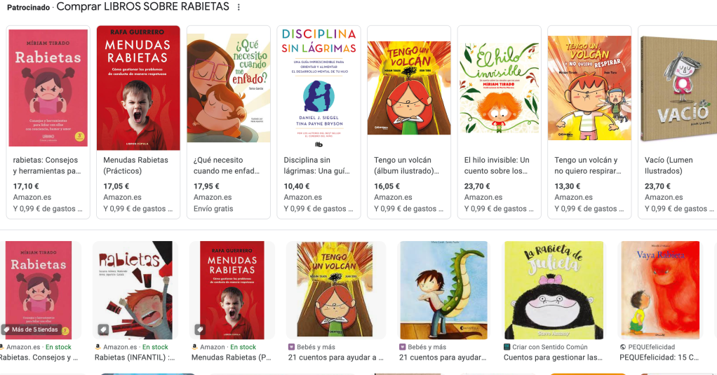 Una búsqueda en internet se salda con títulos como Menudas rabietas, de Rafael Guerrero; Rabietas: Consejos y herramientas para lidiar con ellas con conciencia, humor y amor, de Miriam Tirado; Ni rabietas ni conflictos, de Rosa Jové; No más rabietas: Claves para evitar y solucionar los conflictos con tu hijo, de Isabelle Filliozat o ¡Mamá, no grites! en el que su autora, Paula Davies, propone “usar la Disciplina Positiva para ser escuchado y evitar rabietas”.