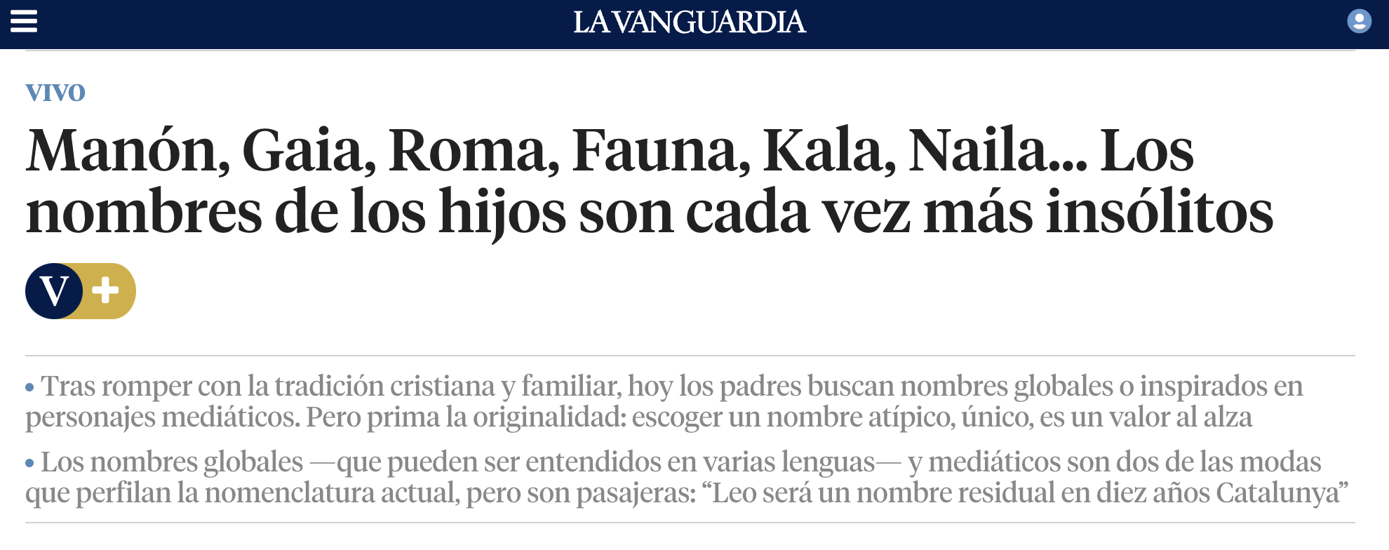 Manón, Gaia, Selva, Índigo, Capri, Roma, Fauna, Kala, Naila… Como la sociedad, los nombres de pila se transforman. Tras romper con los santos y las vírgenes y huir de la tradición familiar, hoy los padres buscan nombres globales o inspirados en personajes mediáticos. Pero el factor de la originalidad: que la descendencia tenga un nombre atípico, único, es un valor al alza. Este es el tema al que le he dedicado mi reportaje, publicado en La Vanguardia, y que también os comparto: