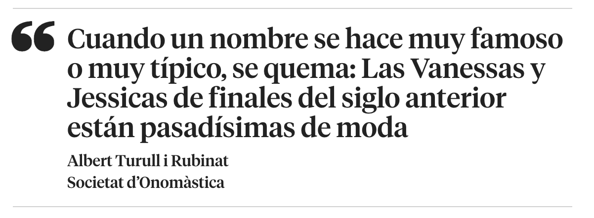“Los nombres se saturan, cada vez con mayor rapidez”, coincide Albert Turull. En parte, debido a esta frenética búsqueda de la originalidad, que hace que cuando hay demasiados Liams, Jans, Izanes, Lias o Lunas en la clase, se busquen otras opciones. “Cuando un nombre se hace muy famoso o muy típico, se va frenando o se quema: “Las Vanessas y las Jessicas, de finales del siglo anterior, están pasadísimas de moda”, dice Turull, que desvela que Vanessa se puso de moda por la hija del cantante Manolo Escobar. Y es que, para bien o para mal, la farándula impacta en cómo nos llamamos: “Ramona era un nombre muy frecuente y su diminutivo Ramoneta, también, pero en los 70 salió aquella canción de La Ramona pechugona y… ¡Se acabaron en seco! El nombre no tiene la culpa, pero las circunstancias sociales, influyen”.
