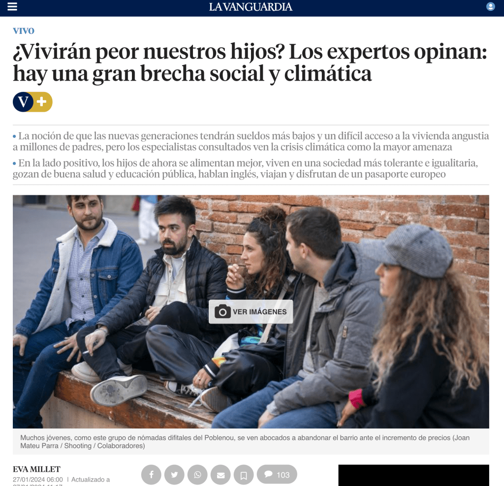 La percepción, casi una espada de Damocles, de que los hijos van a vivir peor está marcando las crianzas actuales. La noción de que las nuevas generaciones tendrán sueldos más bajos, falta de vivienda y un planeta hostil, angustia a millones de padres. Pero, esta idea: ¿es un axioma o hay matices? En ciertos aspectos, ¿no están viviendo mejor, nuestros hijos? Os comparto el artículo escrito para La Vanguardia sobre una cuestión que, como madre y periodista, hace tiempo que me preocupa e intriga. Para el mismo entrevisté a expertos de diferentes ámbitos que opinan sobre un tema en el que hay grises y una línea roja: la crisis climática.
