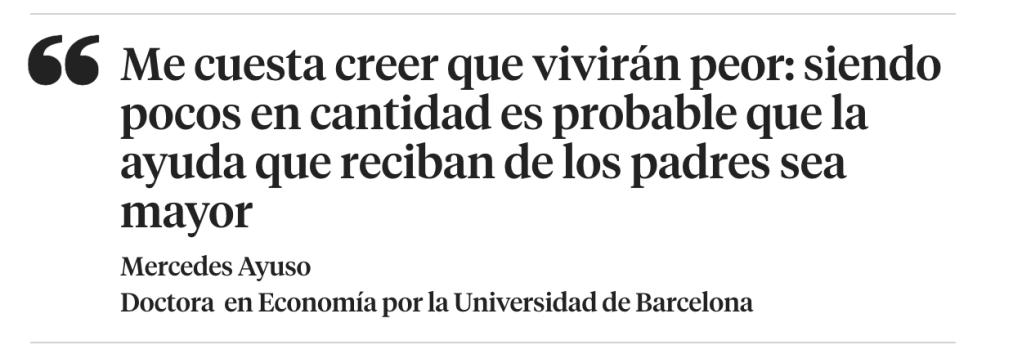 Para Mercedes Ayuso, doctora en Economía por la Universidad de Barcelona, las actuales incertidumbres a nivel económico y social son muy elevadas. “Pero cuando regresamos al pasado, es difícil pensar que no hubiera también incertidumbre”. De todos modos, añade: “Es cierto que en el momento actual se perciben más las inequidades en estas generaciones, sobretodo por la relevancia de variables socioeconómicas, como el nivel formativo o las posibilidades de acceso a una vivienda”. Ayuso es catedrática de Estadística Actuarial y madre de dos hijos, nacidos a principios de este siglo. Le “cuesta creer”, que vivirán peor: “Sobre todo, porque siendo pocos en cantidad —la sociedad está apostando más por la “calidad” que por la “cantidad” de hijos—, es probable que la ayuda que reciban de los padres, incluso en forma de herencia, sea mayor. Aunque lógicamente, esta afirmación no está exenta de circunstancias particulares”.