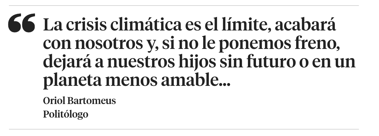 Políticas que también deben intensificarse en una crisis que, para los entrevistados, supone la mayor amenaza al bienestar de las futuras generaciones: la emergencia climática. “La crisis climática es el límite, acabará con nosotros y, si no podemos freno, dejará a nuestros hijos sin futuro o, como mínimo, en un planeta menos amable”, reitera Oriol Bartomeus, autor de El peso del tiempo. Relato del relevo generacional en España (Debate). Este politólogo tiene claro que nos jugamos, ni más ni menos, que el futuro de la especie. “El problema es que se ha convertido en algo político, de derechas e izquierdas y, mientras tanto, pasa el tiempo”.