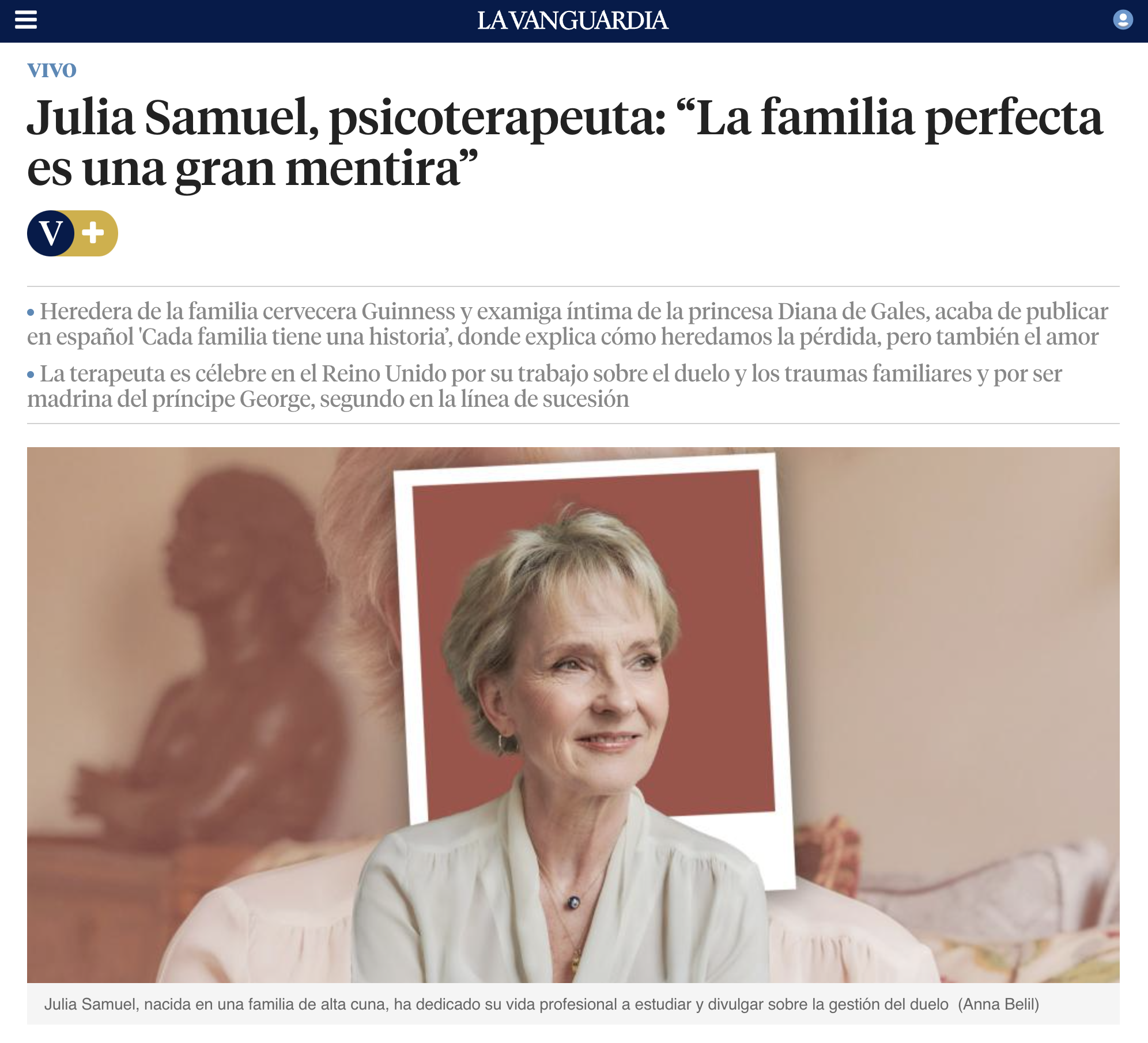 Samuel es también conocida por su estrecha amistad con Diana de Gales, a la que conoció a finales de los años ochenta. Diana fue la madrina de uno de sus hijos y hoy Julia es madrina de su nieto y segundo en la línea de sucesión de la corona británica, el príncipe George, hijo de Guillermo y Catalina. Esto es algo que le hace, asegura, muy feliz, “y es una manera fabulosa de quererla”, dijo en The Guardian. Pero la entrevista no versa sobre la desaparecida princesa, cuya pérdida todavía le entristece, sino sobre su faceta como escritora y terapeuta, reflejada en ‘Cada familia tiene una historia’, publicado en castellano por la editorial Kairós.