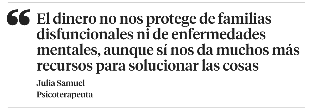 Los datos demuestran que vivir en pobreza provoca más enfermedades, menor esperanza de vida y felicidad. Esto es verdad, pero también es verdad que esa percepción de que si tienes dinero no sufres, no es cierta. La primera historia de mi libro es una prueba. Y hace poco entrevisté para mi podcast a Charles Spencer [hermano de Diana de Gales], donde cuenta que, de niño, fue físicamente y sexualmente abusado en el internado y no tuvo la protección en casa: es esta terrible desconexión de vivir en una mansión, siendo un aristócrata, pero, en el interior, estar solo y profundamente empobrecido. El dinero no nos protege de familias disfuncionales ni de enfermedades mentales, pero nos da muchos más recursos para solucionar las cosas.