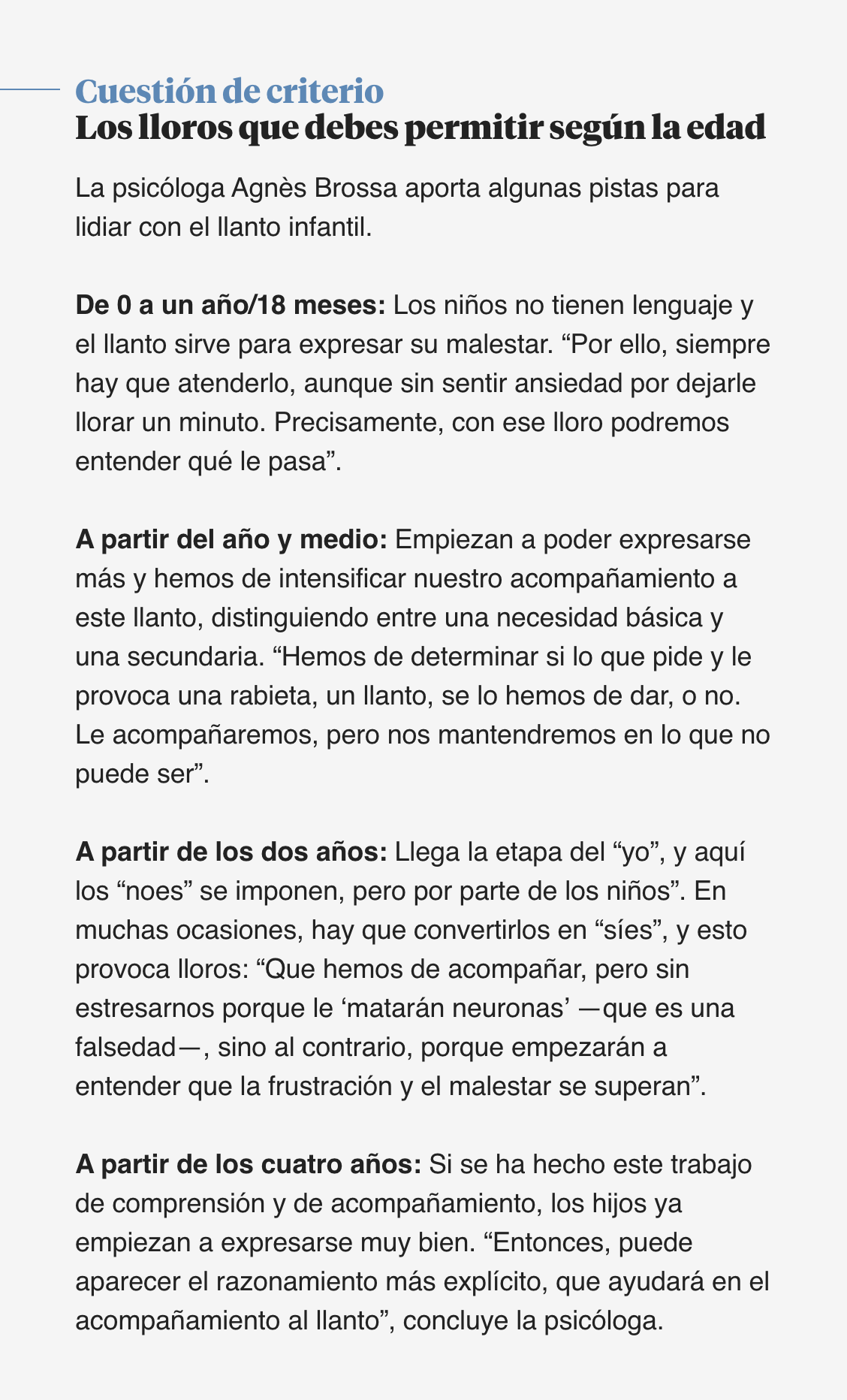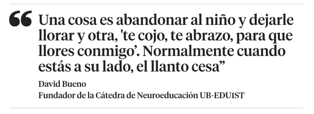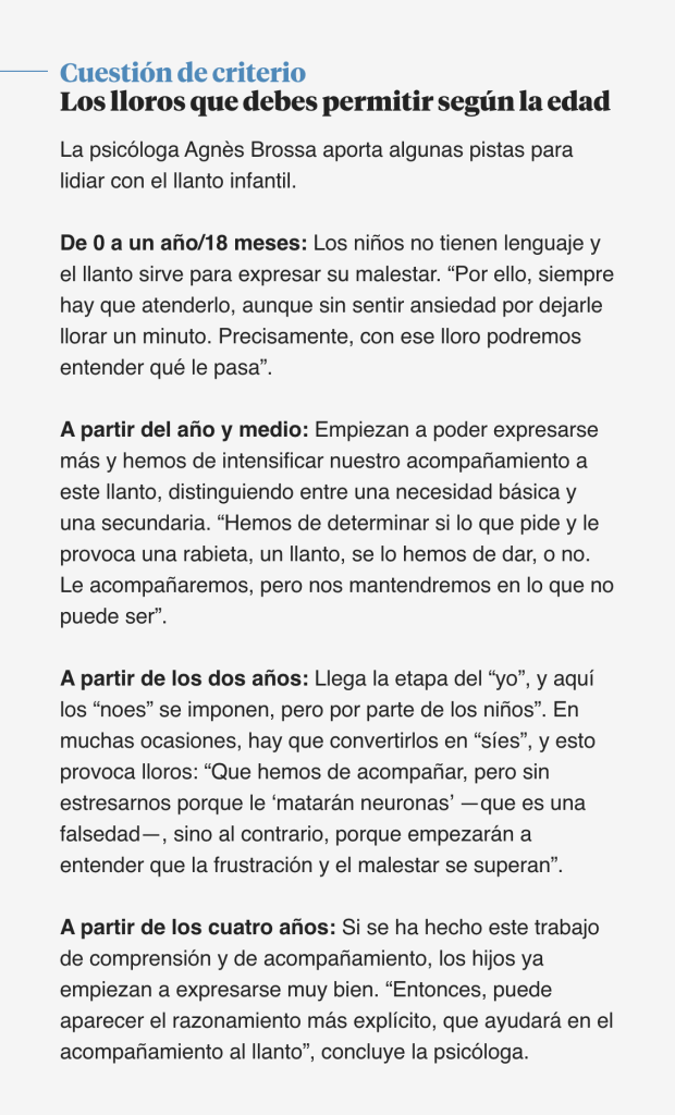 Para indagar en esta nueva falsa verdad —muy vinculada a la guerra cultural que hay en la crianza—, hablé con dos profesionales: el experto en neuroeducación, David Bueno, y la conocida pediatra Lucía Galán. La psicóloga familiar, Agnés Brossa, me dio unas pistas para lidiar con el llanto de los hijos.