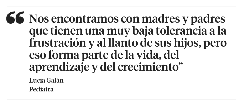 La conocida pediatra Lucía Galán también detecta este creciente ansiedad de los padres ante el llanto de su prole. Una cuestión, explica, en la que la edad es un factor determinante. “Porque efectivamente, en los bebés chiquititos, su única manera de pedir ayuda es llorando. Y, por supuesto que tenemos que cogerlos y achucharlos, estamos creando un vínculo maravilloso, a través del contacto”. Pero otra cosa, señala: “Es un niño de tres años que está haciendo algo, se frustra y llore”.