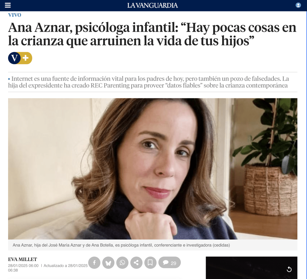 Criar sin miedos. Disfrutar de los hijos. No dejar que el/la ‘influencer’ de turno te angustie porque un día dejaste llorar a tu hijo, no estás enganchada al bebé 24/7, hiciste el método Estivill, le has dicho «no» y le diste azúcar alguna vez… Como dice Ana Aznar, psicóloga infantil: «Hay pocas cosas en la crianza que arruinen la vida de tus hijos». Ella es la artífice de REC PARENTING, una web dedicada a proporcionar datos fiables sobre crianza, que resulta una herramienta muy útil en tiempos de desinformación en redes. La entrevisté para La Vanguardia. Os comparto también por aquí la charla:
