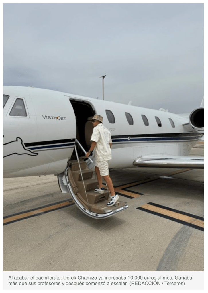 Derek Chamizo nació en Sabadell hace 22 años y vive en Dubai desde hace tres. ¿Las razones? No quiere pagar impuestos. En su Instagram (@youtubemillonario), jalonado de imágenes suyas en suntuosos interiores, se describe como “fundador de la primera y más grande academia de Social Automation”. Un modelo de negocio, explica sucintamente a La Vanguardia , “que se basa en crear canales de YouTube para que generen beneficios”. Él empezó a generarlos durante el Bachillerato. “Al acabarlo ya ingresaba más de 10.000 euros al mes. ¡Ganaba más que mis profesores! Después, ya pude centrarme más en mi negocio y empecé a escalar una barbaridad”. Escaló tanto, que su primera declaración de la renta fue demasiado para él: “Prácticamente la mitad de lo que estaba ganando lo estaba soltando en impuestos abusivos, que se destinan a cosas con las que no estoy de acuerdo”, dice. “No me parecía muy normal, así que preferí irme a un país donde no me robaran y vine a Dubai; un lugar que me inspira”.
