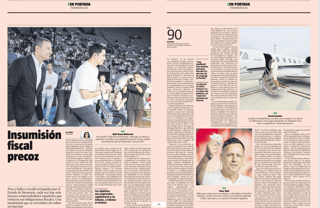 Derek y Javier son dos ejemplos de un fenómeno en sintonía con los tiempos: el de jóvenes –en su mayoría, varones–, que aspiran a forrarse rápidamente gracias a la economía digital, pero sin tributar. Los impuestos, repiten, son injustos, están mal gestionados o no sirven para nada; el estado del bienestar no les atañe. Este tipo de mensajes se escuchan en redes sociales y en actos como el Madrid Economic Forum, celebrado el pasado 7 y 8 de junio y patrocinado por dos plataformas de criptomonedas. En el mismo, ponentes como el youtuber Wall Street Wolverine (afincado en Andorra) y el presidente argentino, Javier Milei, reivindicaron reducir el estado al mínimo y proclamaron que los impuestos “son un robo”. El público compuesto, en su mayoría, por hombres jóvenes, jaleó sus palabras.