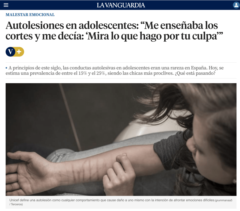 Este es un artículo que quería publicar hace tiempo, pero no había contado con un testimonio hasta ahora. Entrevisté a una madre y a una hija que se autolesionaba, la cual —al preguntarle si era consciente que se hacía daño— me dijo que no: «Porque como lo hacía cuando estaba triste o depresiva, el dolor de estas emociones era más fuerte que el de los cortes”. En el texto también cito a la psicóloga Raquel Duque, que alerta del papel de las redes sociales en esta práctica. “Desgraciadamente, hay muchísimo contenido que normaliza e, incluso, idealiza, la autolesiones», explica.