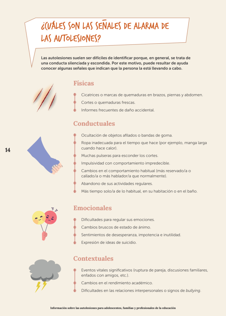 Al ser conductas clandestinas, las autolesiones suelen ser difíciles de identificar. Pero hay señales de alarma: físicas (cicatrices o quemaduras en brazos, piernas y abdomen), conductuales (llevar siempre manga larga o pulseras para esconder los cortes, pasar mucho tiempo en el baño) y emocionales. Entre estas últimas se incluyen cambios bruscos del ánimo, desesperanza e, incluso, la expresión de ideas de suicidio. Aunque tanto Unicef como otras fuentes hacen hincapié que una autolesión es un acto no suicida, si estas son recurrentes, se consideran un factor de riesgo. Por tanto, hay que prestarles mucha atención: “Porque aunque no haya una intención autolítica manifiesta, son una señal a atender de inmediato. Y, si se detectan ideas suicidas, activar los protocolos necesarios”, insta Raquel Duque.